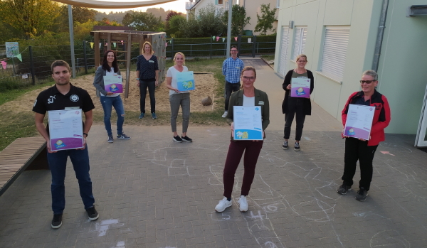(25.09.2020) Nach eineinhalb Jahren Vorbereitung und gemeinsamer Arbeit konnten die Kita Lillipuz aus Kaan-Marienborn und die ortsansässigen Vereine TuS und 1. FC Kaan-Marienborn die Gütesiegel „Anerkannter Bewegungskindergarten“ und „kinderfreundlicher Sportverein“ in Empfang nehmen. Mit der Vergabe der Gütesiegel waren jedoch im Vorfeld einige Vorrausetzung verbunden, die die verschiedenen Institutionen erfüllen mussten. So wurde die Kita auf Bewegungszeiten während eines Tages im Regelbetrieb und auf Bewegungsmöglichkeiten im Innen- und Außenbereich hin geprüft.