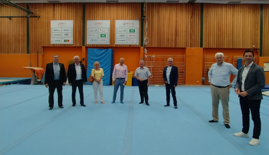 Im Anschluss an die Unterzeichnung des Kooperationsvertrages zwischen dem Kreissportbund Siegen-Wittgenstein und der Stiftung „Anstoß zum Leben“ besuchte die Delegation, rund um LSB-Präsident Stefan Klett, KSB-Vorsitzender Ottmar Haardt und Landrat Andreas Müller, das Trainings- und Leistungszentrum der Siegerländer Kunstturnvereinigung (SKV).